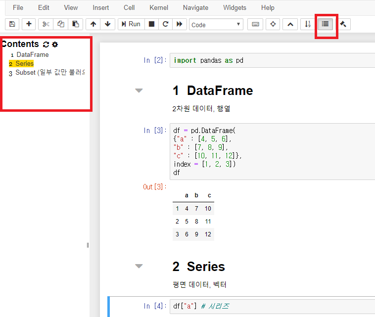 - 아이콘을 클릭하면 왼쪽에 목차를 확인 할 수 있다