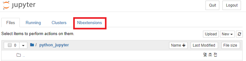 - 설치 전 주피터 노트북 홈 화면 Nbextensions 탭 없음, 탭 3개