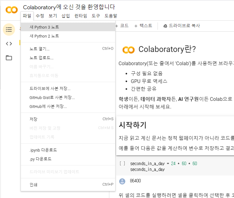 참고로 상단 메뉴의 런타임을 클릭해보면 실행 옵션들을 확인할 수 있다.