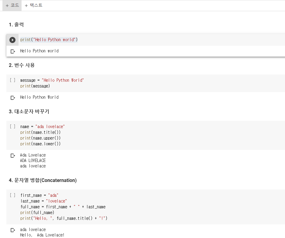 첫 코딩 연습은 변수 및 문자열 사용법이다.