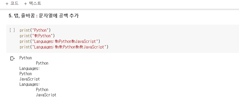 **5. 탭, 줄바꿈 : 문자열에 공백 추가**